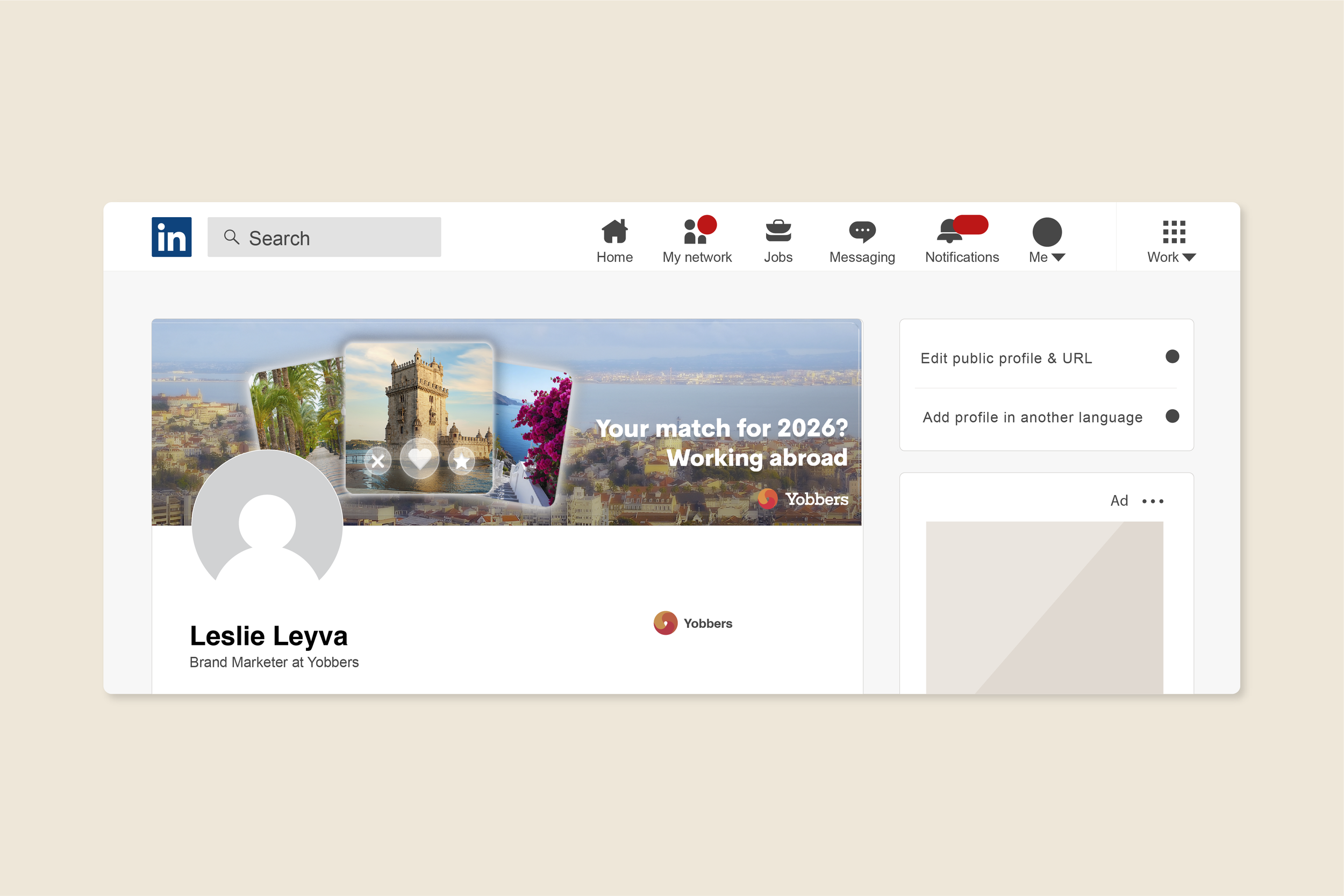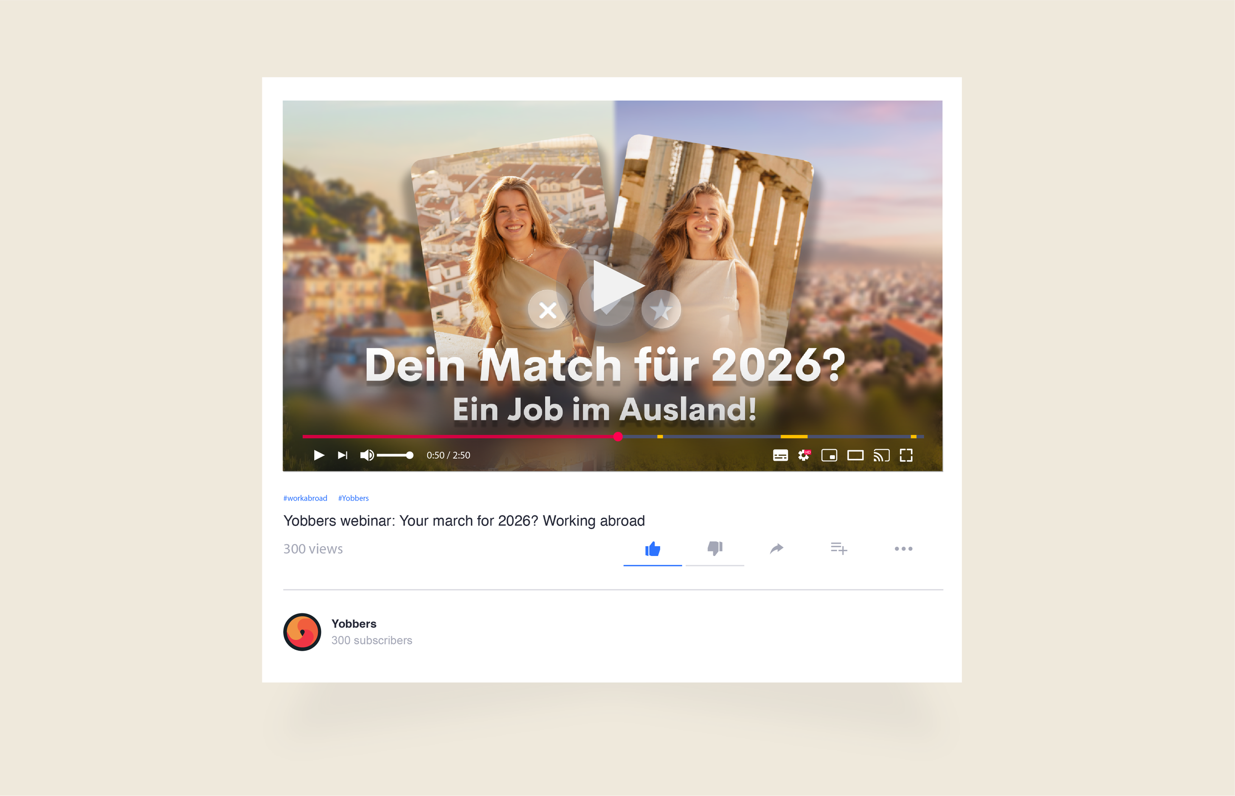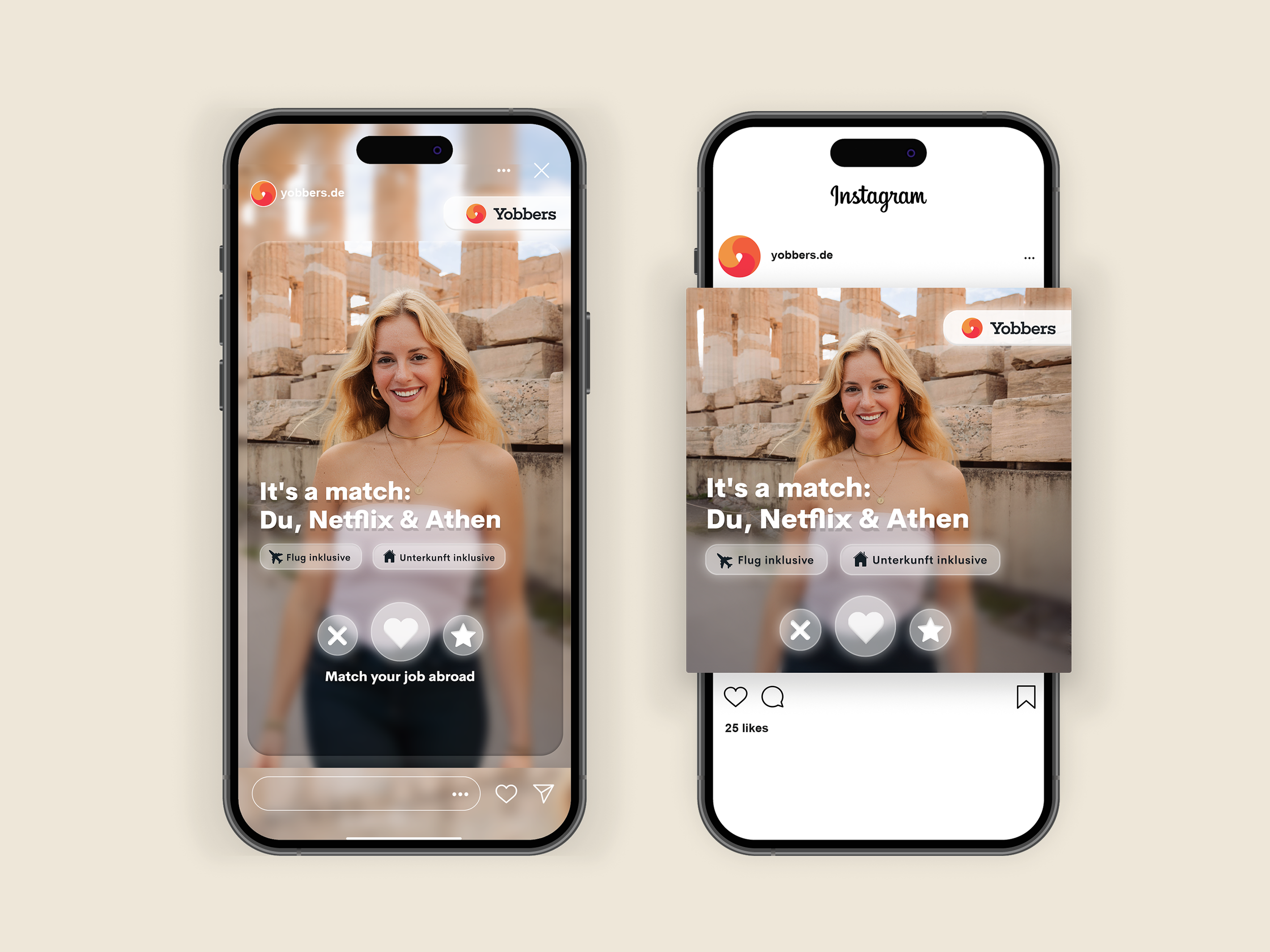 As Brand Marketer at Yobbers, I led the creative direction of the visual communication, working closely with my intern to produce content across multiple channels. The campaign, inspired by dating apps, presented jobs abroad in Spain, Portugal, and Greece as the perfect match for the new year, using familiar app-inspired visuals to connect with Gen Z and Millennial audiences.